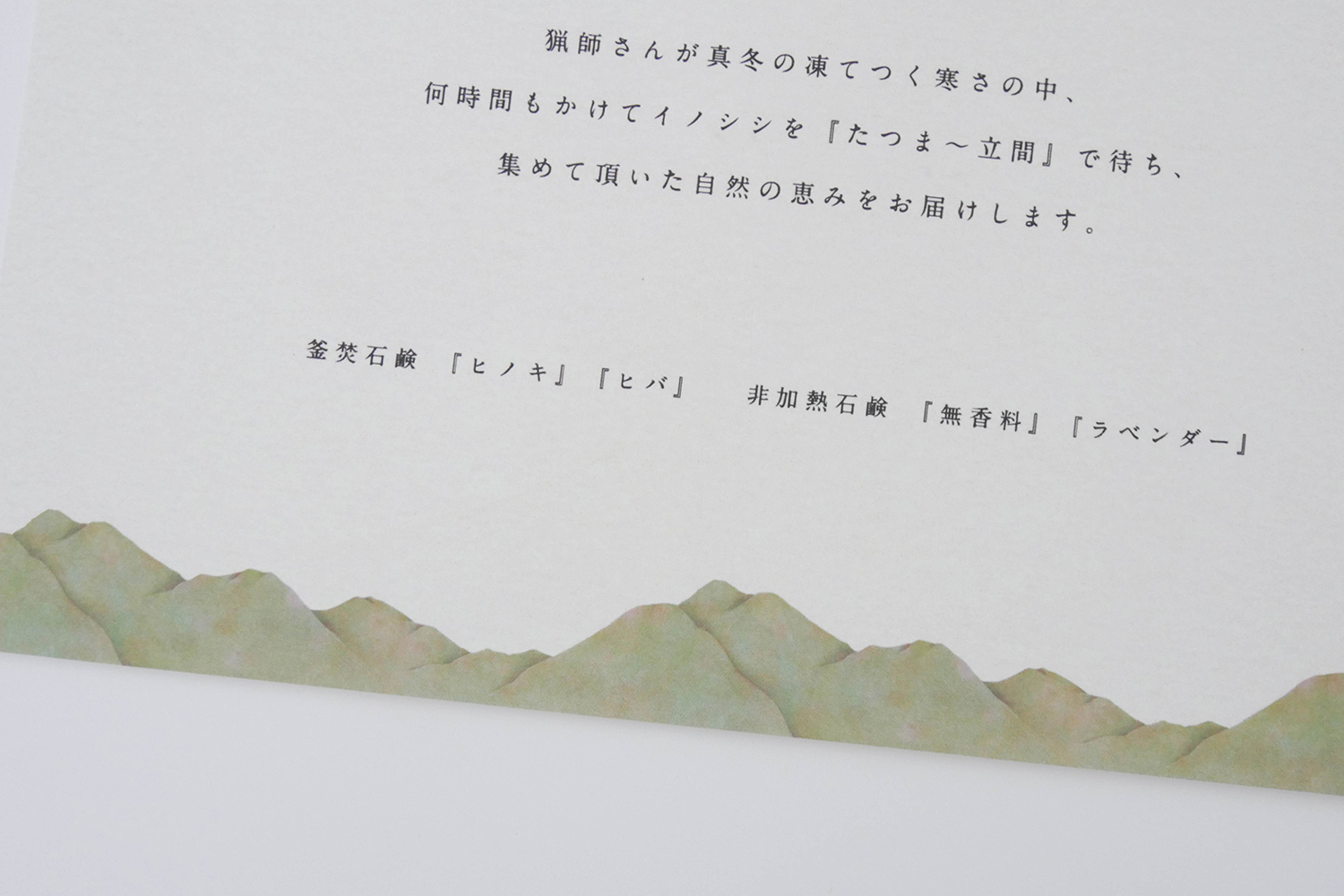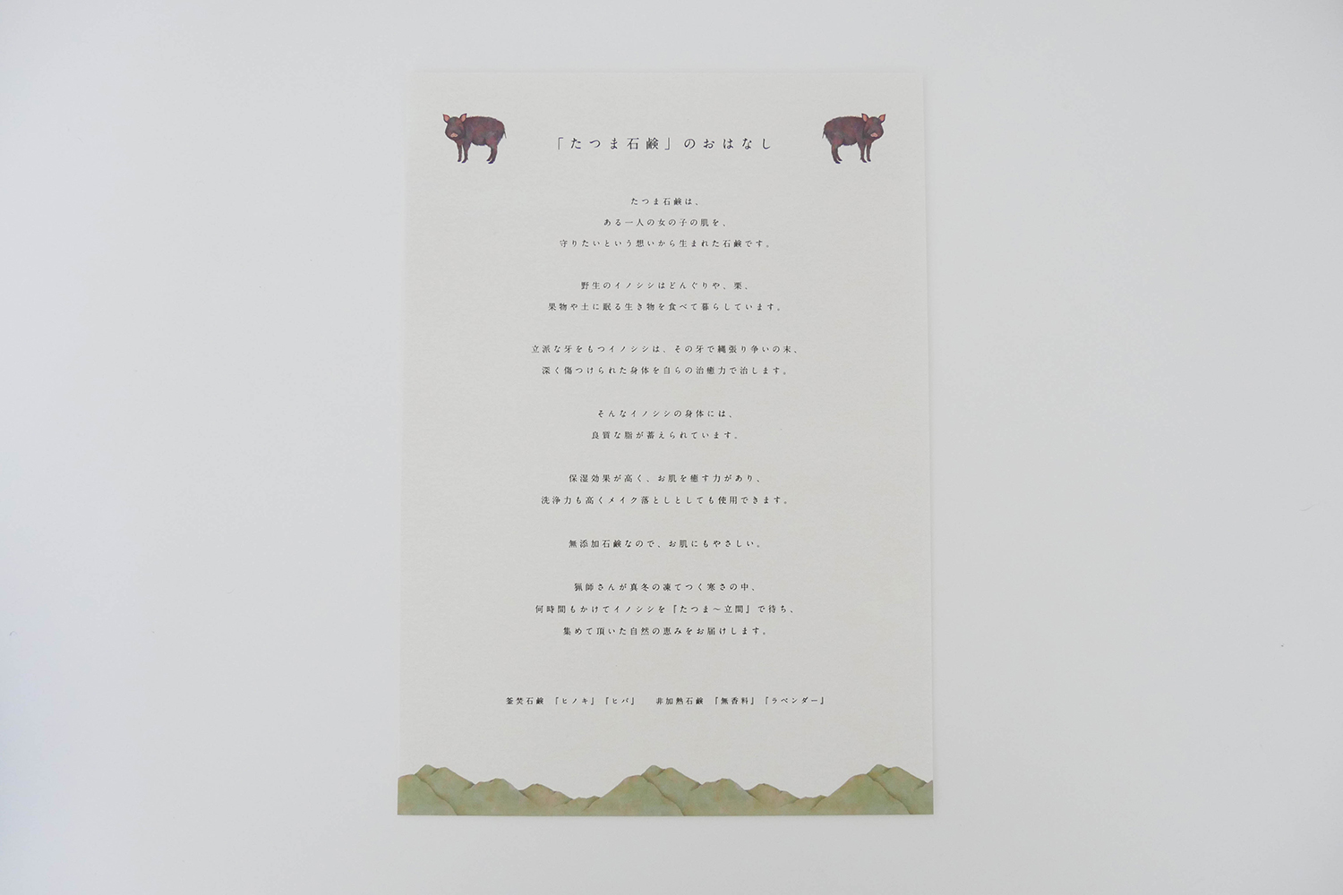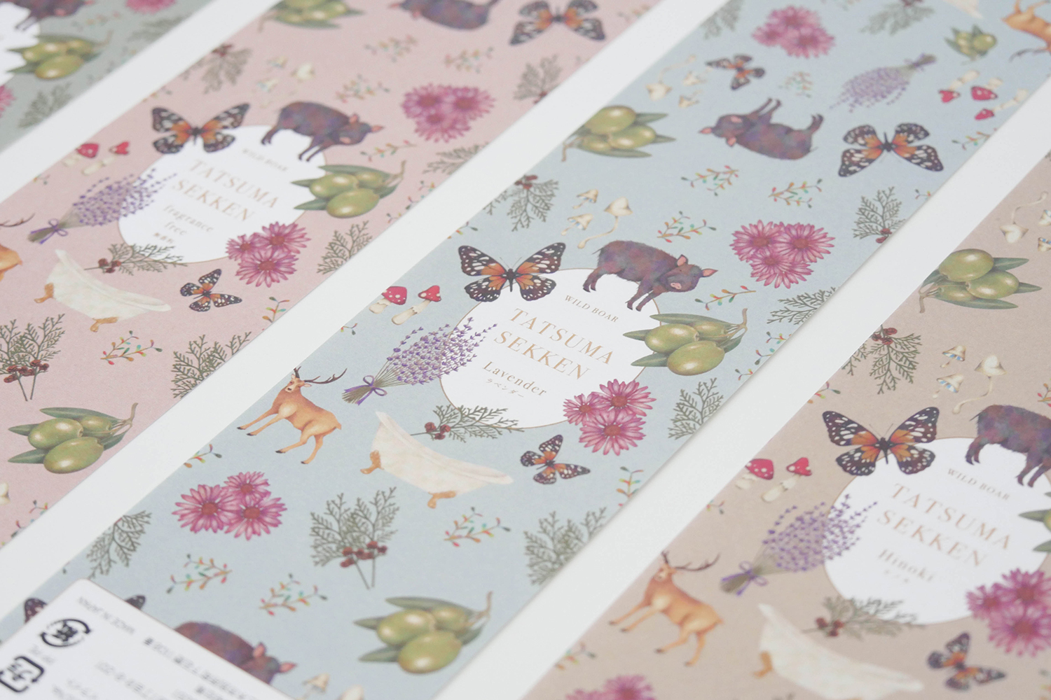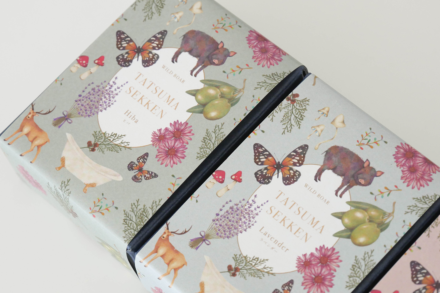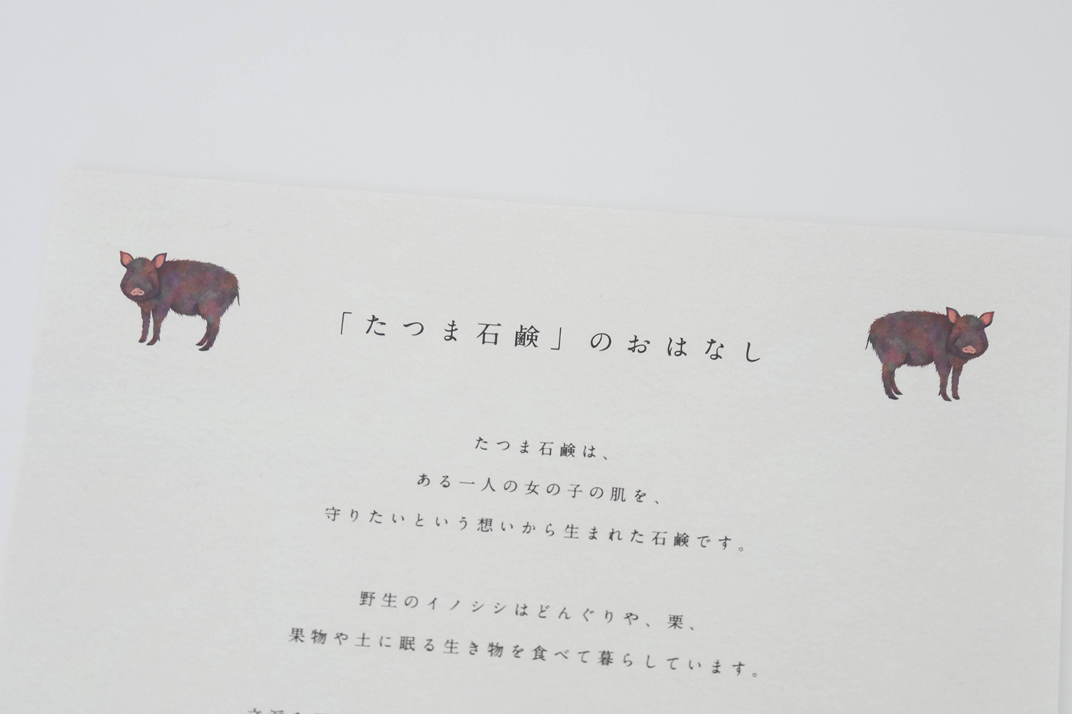 いのししの脂からつくられる「たつま石鹸」のパッケージデザインを担当しました。若い層でも手に取りやすいパッケージデザインを、イラストを中心としてリブランディングしました。